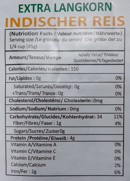 349 kcalFett 0.9 g -- davon gesättigte Fettsäuren 0.3 g Kohlenhydrate 78 g -- davon Zucker 0.3 g Eiweiß 9 g Salz 0.2 g
