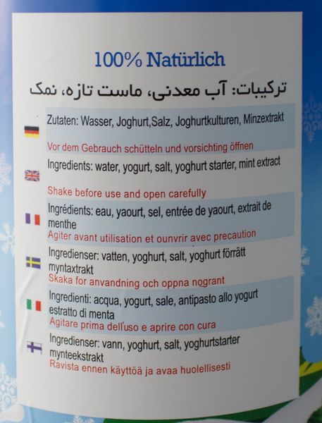Die Zutaten bestehen aus Wasser, Joghurt, Salz, Joghurtkulturen und Minzextrakt. Ayran passt hervorragend