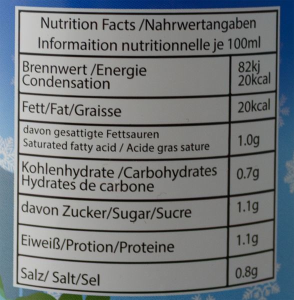 20 kcalFett 120 g -- davon gesättigte Fettsäuren 1 g Kohlenhydrate 0.7 g -- davon Zucker 1.01 g Eiweiß 1.1 g Salz 0.8 g