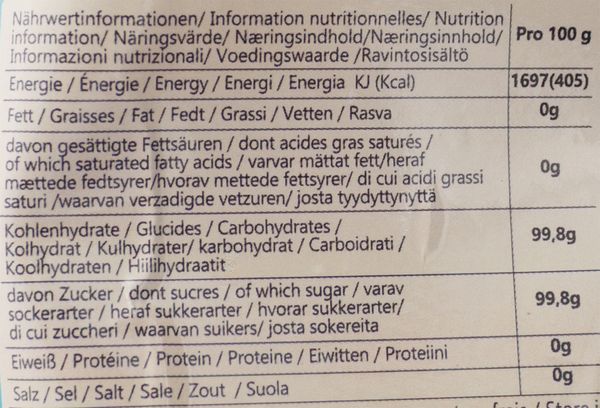 405 kcalFett 0 g -- davon gesättigte Fettsäuren 0 g Kohlenhydrate 99.8 g -- davon Zucker 99.8 g Eiweiß 0 g Salz 0 g
