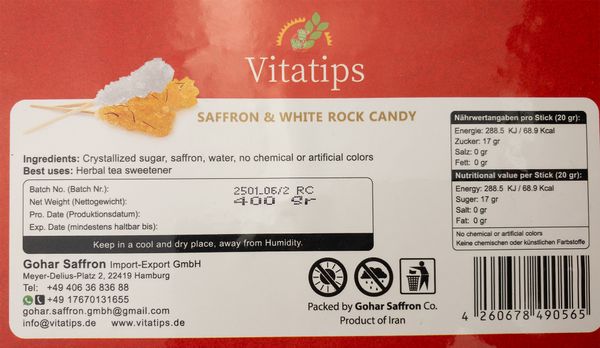 In jeder Packung befinden sich 10 Safran-Kandis-Sticks und 10 weiße Kandis-Sticks – perfekt, um beide Varianten zu genießen oder zu verschenken.