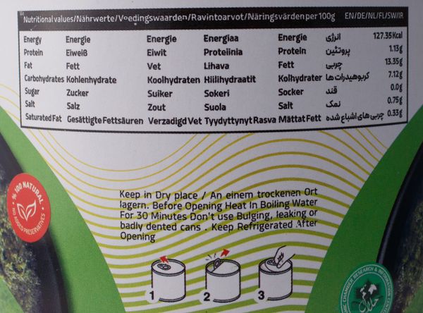 127.35 kcalFett 13.35 g -- davon gesättigte Fettsäuren 0 g Kohlenhydrate 7.12 g -- davon Zucker 0 g Eiweiß 1.13 g Salz 0.33 g