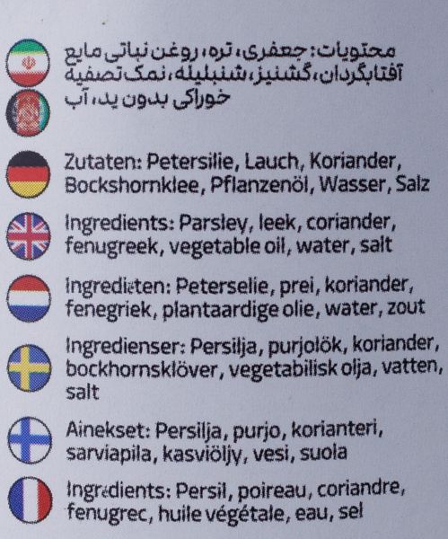 Petersilie, Lauch, Koriander, Bockshornklee, Pflanzenöl, Salz, WasserMHD